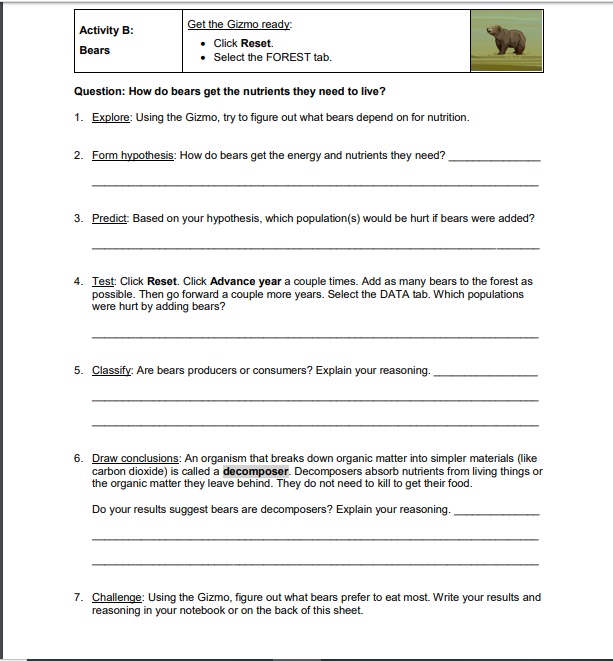 Complete the Gizmos’ worksheet, Activity B, Bears, and