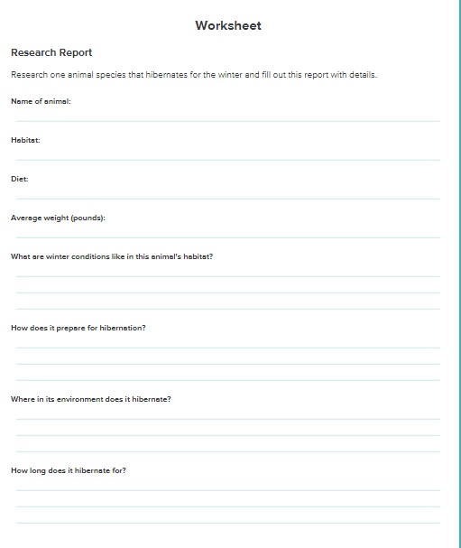 First watch the following video that explain the process of hibernation on animals. Then, complete the hibernation worksheet in which you have to research about one animal that hibernates during the winter. Here is a list of some animals that hibernate, choose one: skunk, beaver, raccoon, hedgehog, bear, rabbit, groundhog, squirrel, prairie dog, bat, chipmunk, and porcupine. Have fun! https://www.youtube.com/watch?v=OhrhcsICrE8