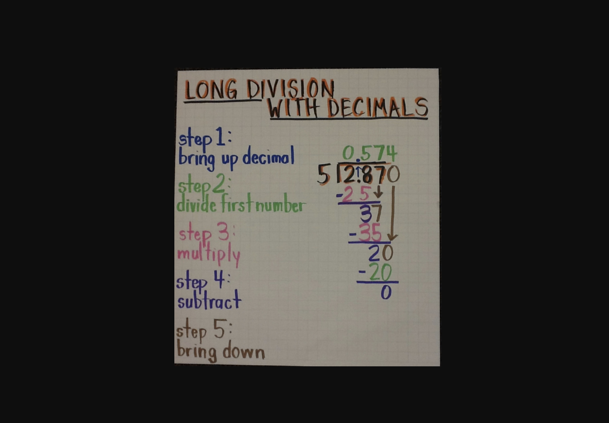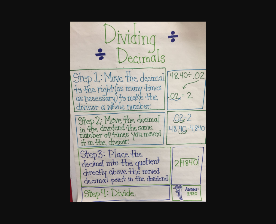 There will also be an anchor chart that will be provided that will show the steps of how to divide decimals using decimal divisors.