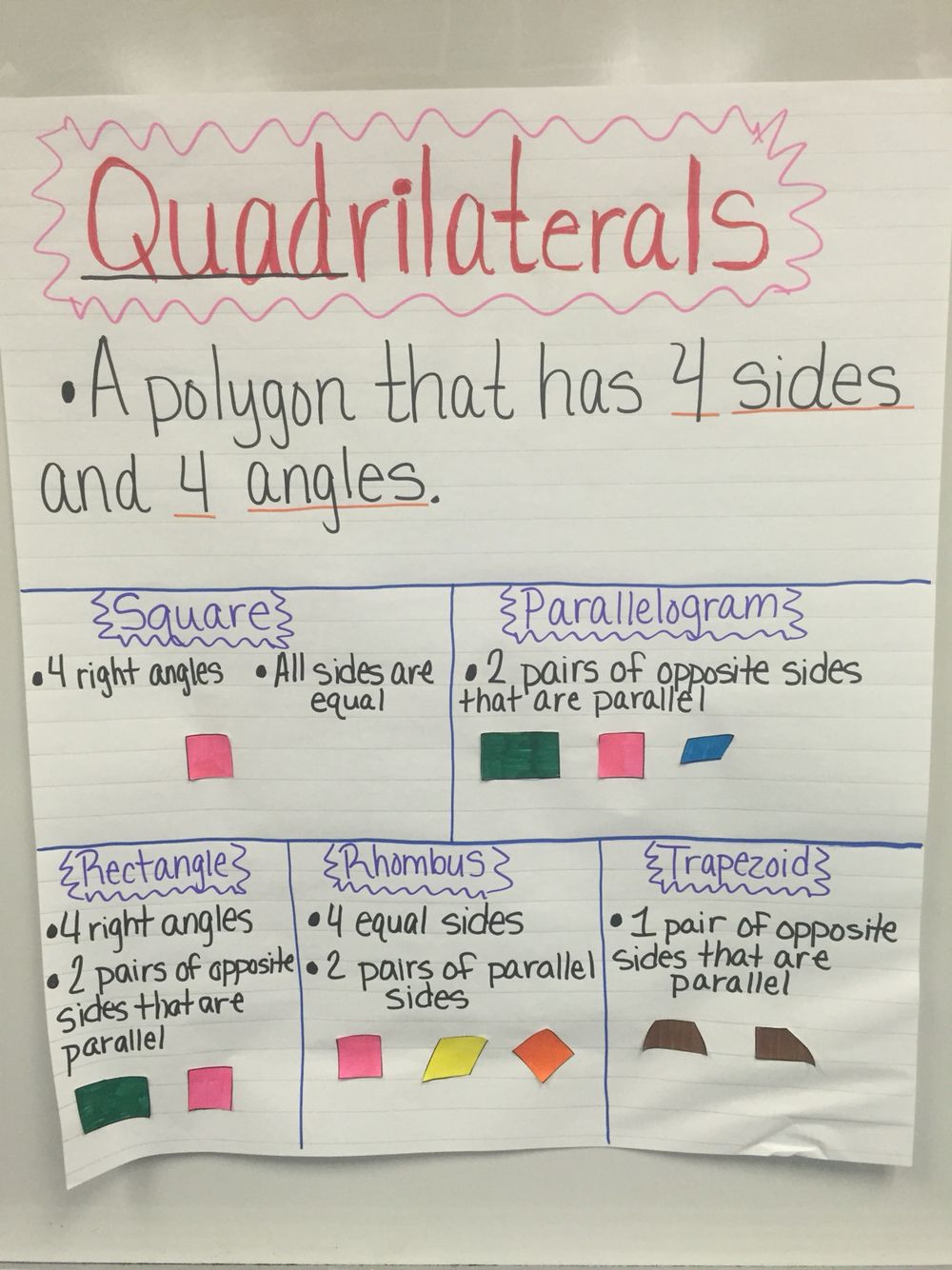 In the files below there will be an anchor chart and a Venn diagram that displays the varying quadrilaterals that could be classified as other quadrilaterals.