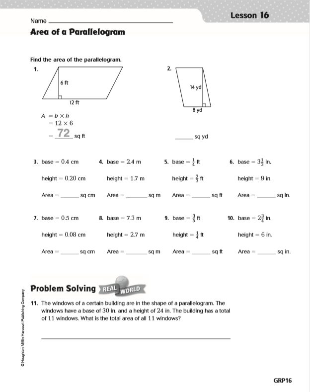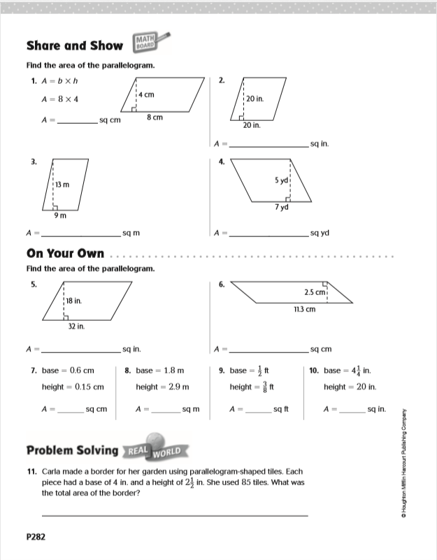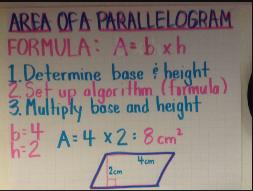 Zoom meeting will begin with the review of the formula to find the area of a parallelogram. Students will apply the area formula to problems to find the area of a parallelogram, using multiplication facts and place value to complete quiz. Students will complete problems 2, 3 , 4 and 7 of the worksheet. They will record their answers on gradecam.