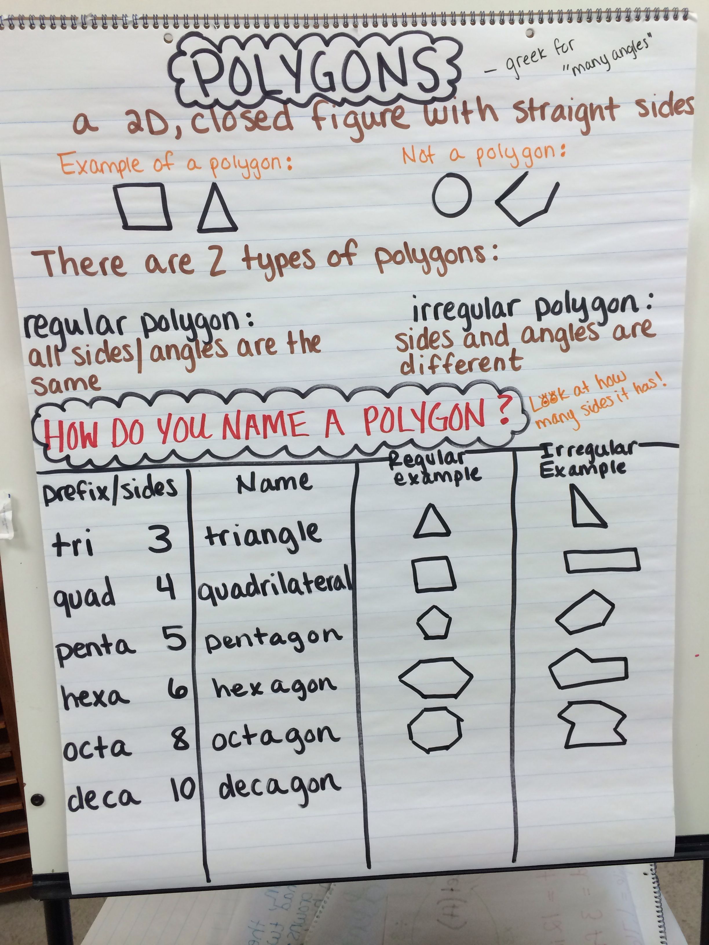 Take a look at the vocabulary of the lesson that will be provided in the anchor chart. It will help with identifying that attributes of a regular polygon and an irregular polygon.