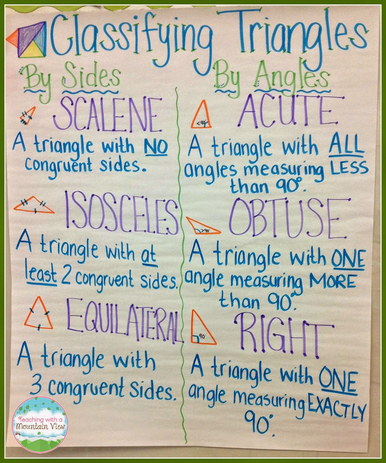Down below their will be an anchor chart that identifies triangles by length and by angles. There will also be a vocabulary sheet with definitions and pictures of varying triangles.