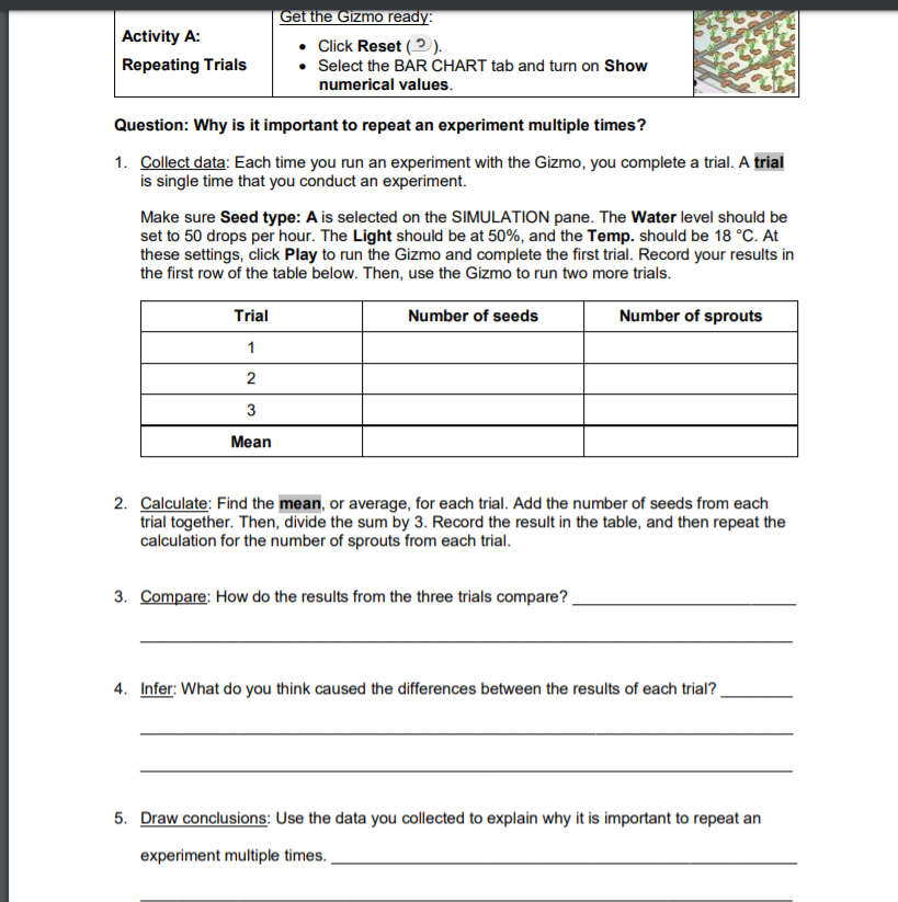 Students will then conduct the seed germination experiment multiple to see the importance of repeating experiments, completing activity A: Repeated Trials worksheet.