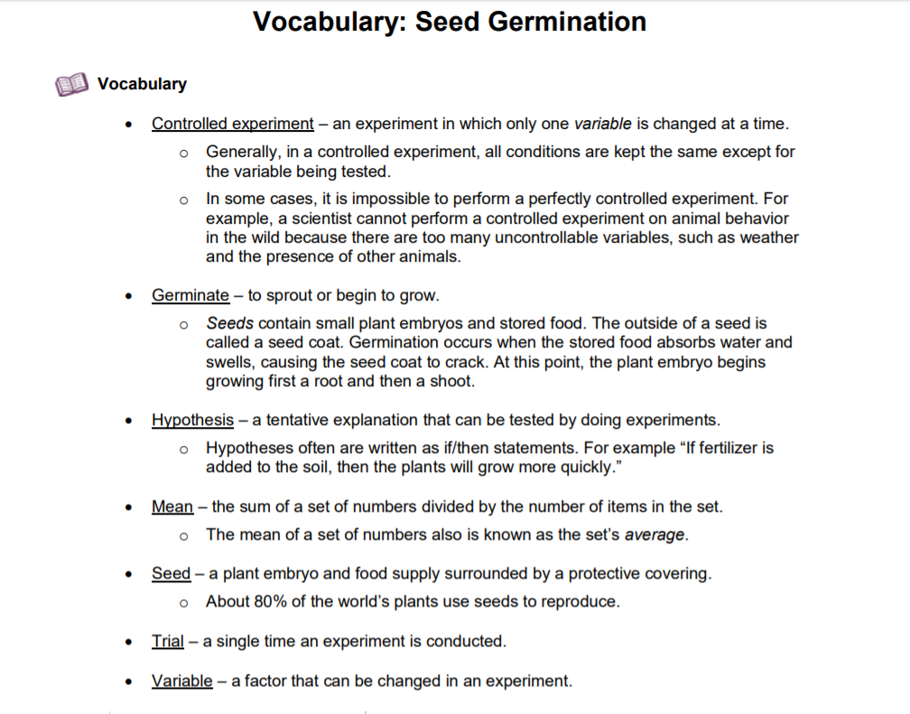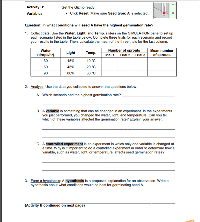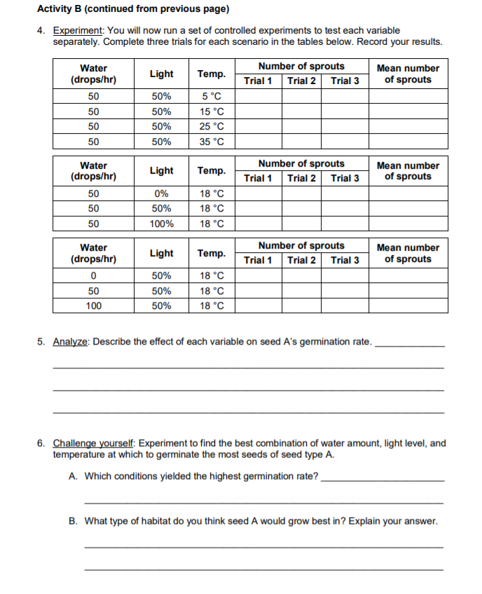Students will then conduct the seed germination experiment using the scientific method to complete Activity B.