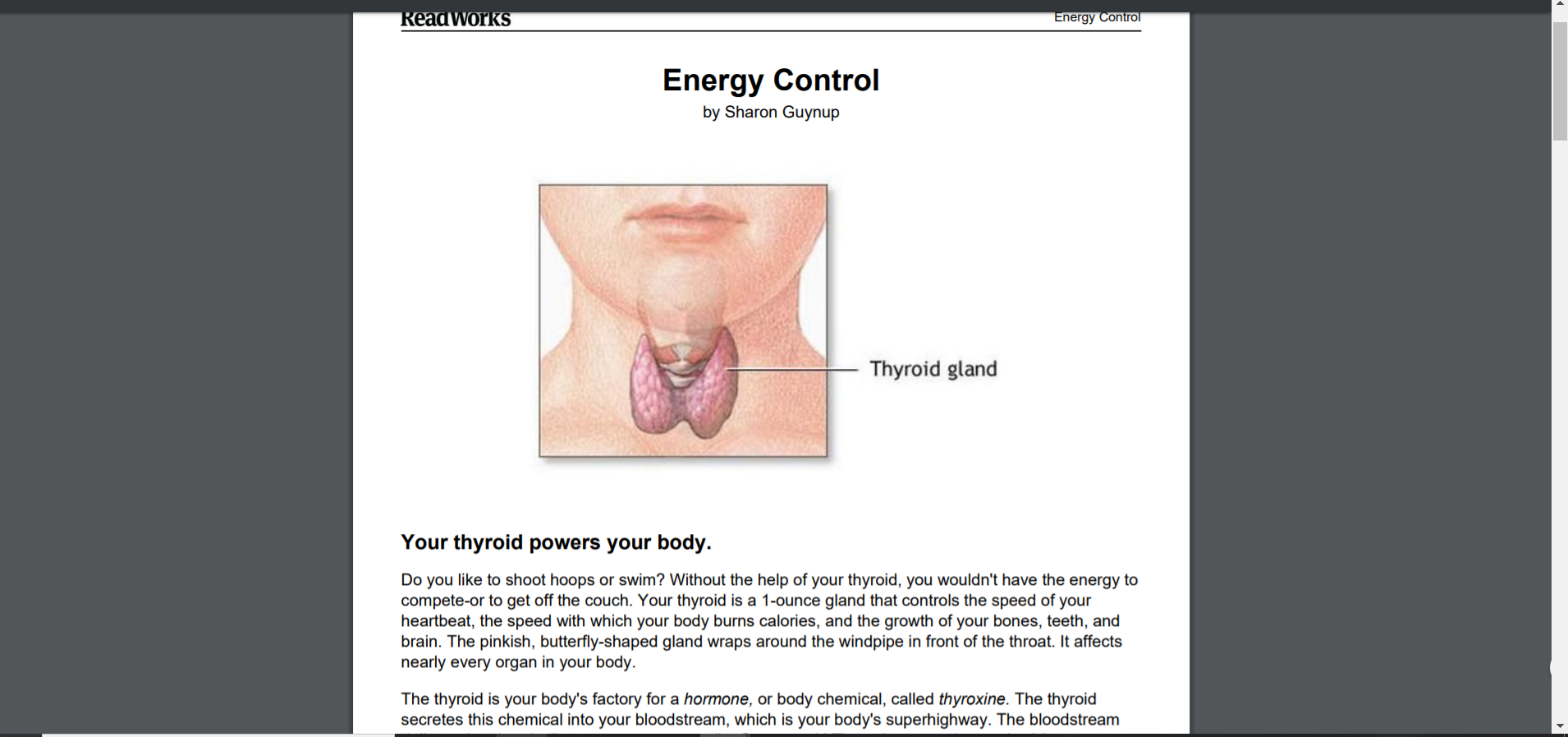 There will be no zoom meeting today. Students will read an article about the importance of the thyroid gland, one of several glands of the Endocrine system. Students will learn about the hormone that the thyroid gland secretes and the importance to several functions of the human body. Students will answer questions provided by article.