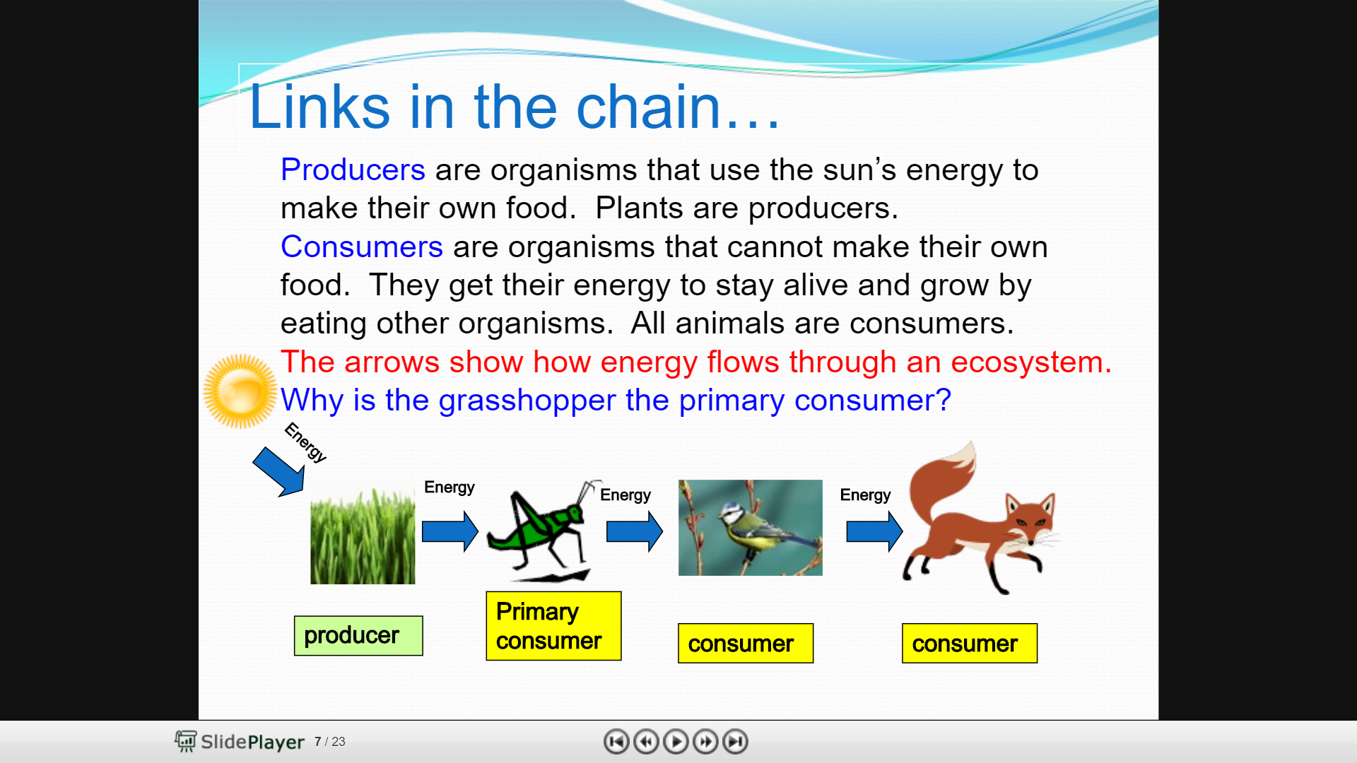 Objective: Student will be able to recognize that producers use energy from the sun to make their food and consumers eat plants or other animals for their food.