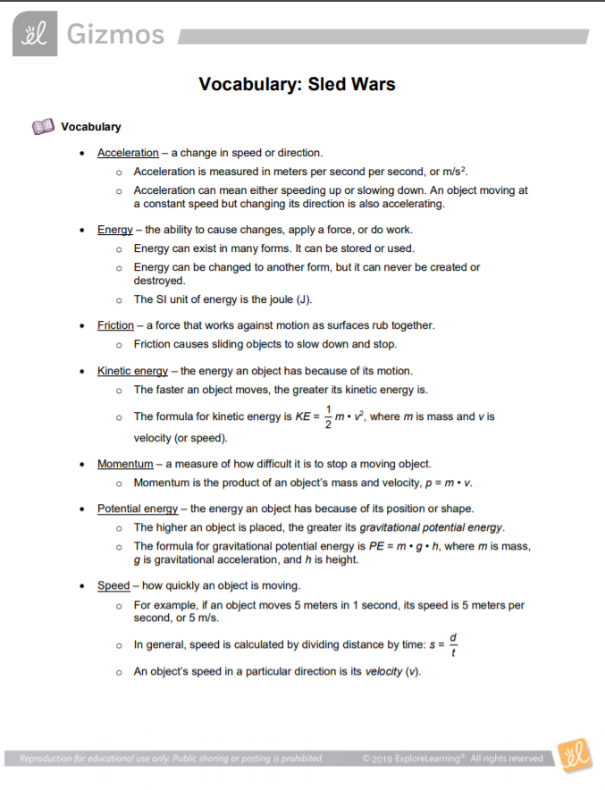 Teacher and students will then work through the activity A of the gizmo. We will explore how the amount of mass, starting height of the sled can influence the acceleration and speed of the sled.